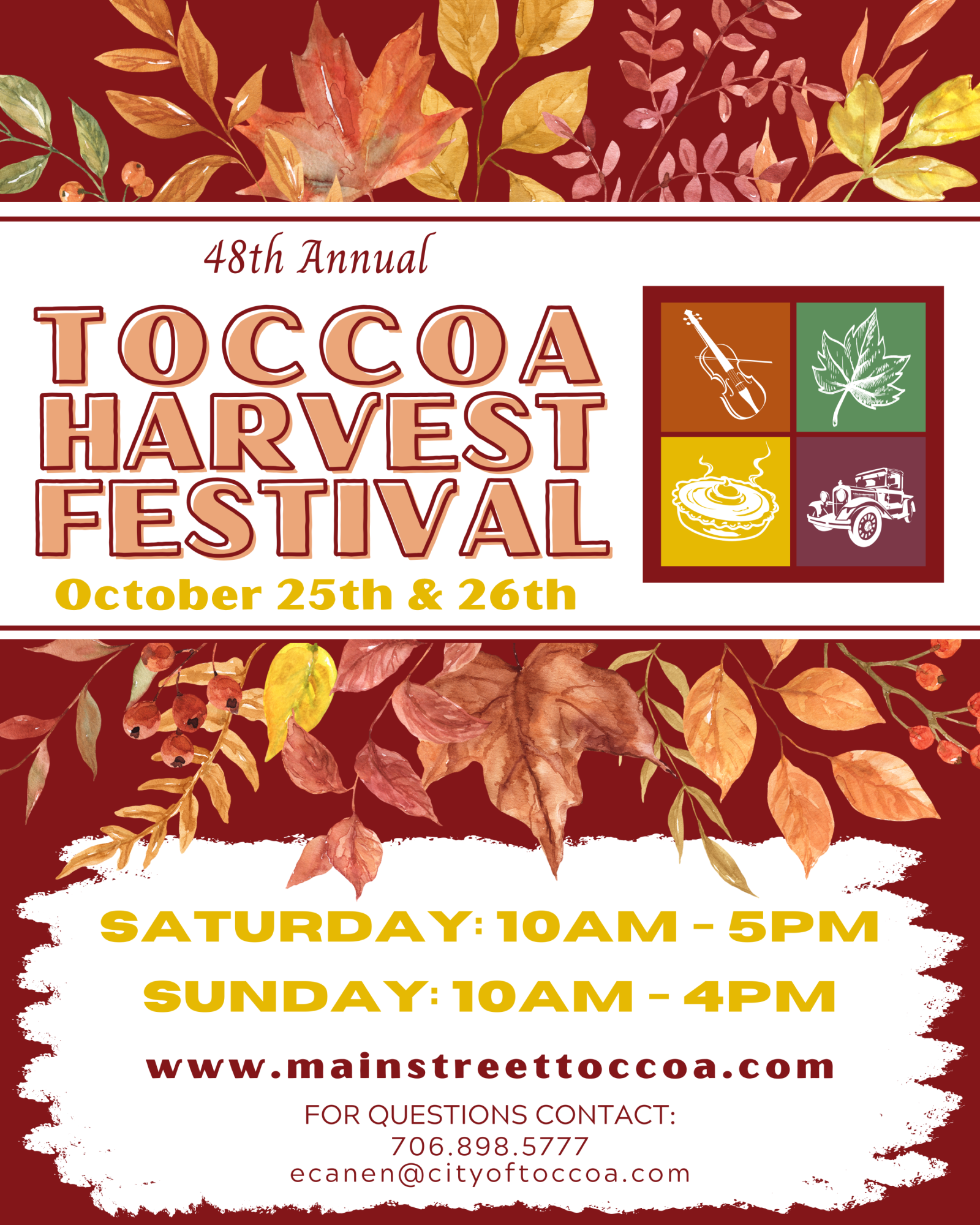 Enjoy lots of craft and food vendors, live music and entertainment, a Classic & Antique Car Cruise In (Saturday 10 AM-2 PM), and kids’ activities. Visit our Harvest Festival page at www.mainstreettoccoa.com for more information.