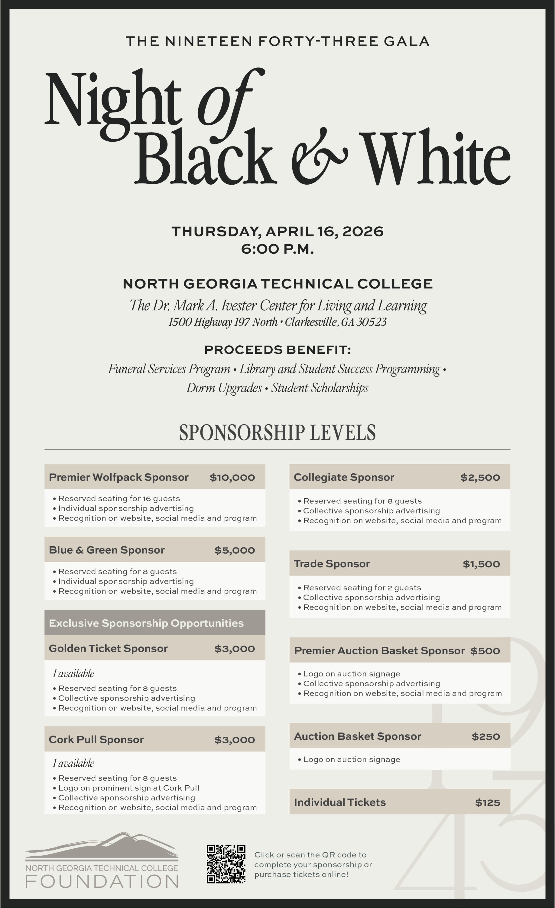 The NGTC Foundation invites you to join us Thursday, April 16, 2026, for a Night of Black & White benefiting NGTC students! The event will feature dinner, a silent and live auction, a live band, and more.